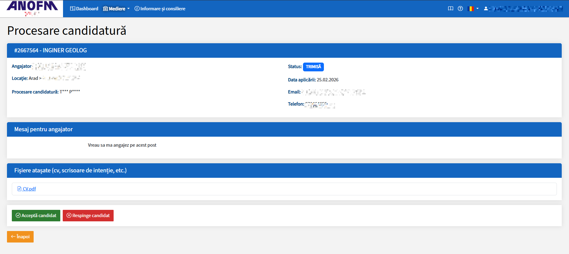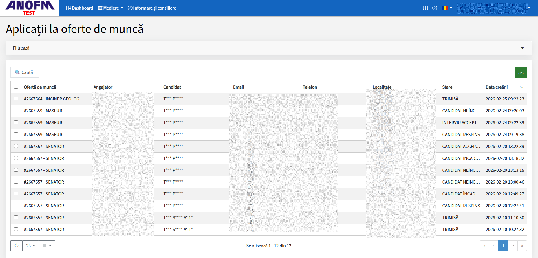 - În lista afișată sunt disponibile toate candidaturile primite pentru ofertele dumneavoastră.