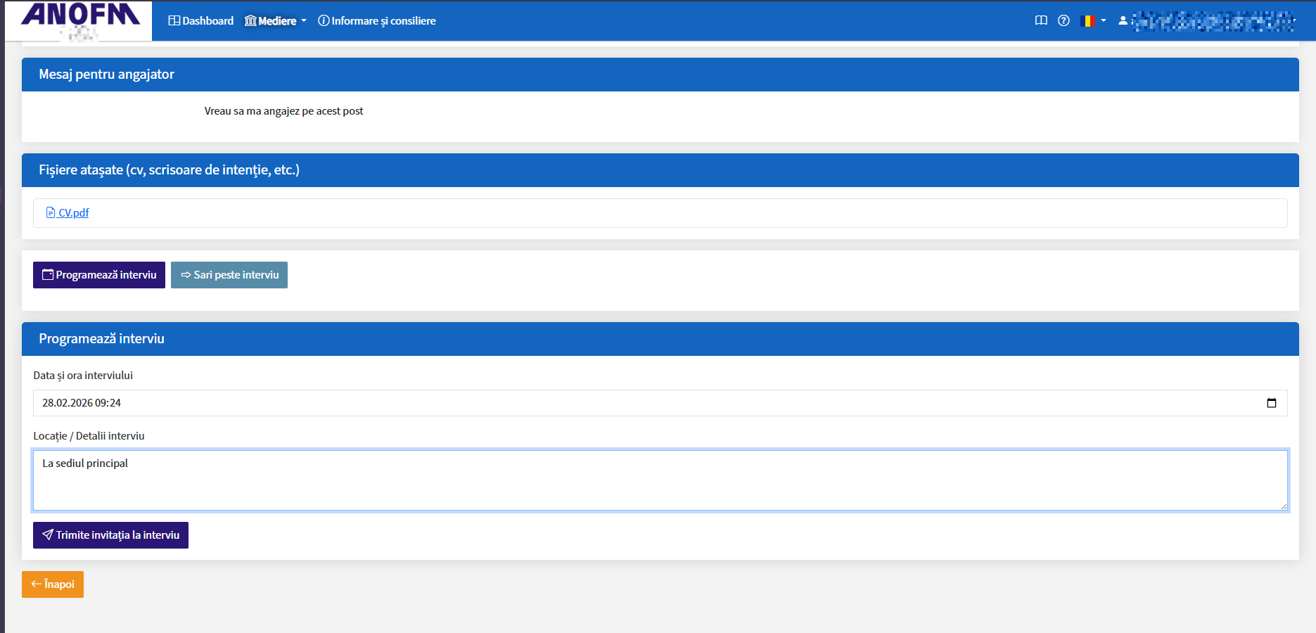 Dacă selectați „Sari peste interviu”, veți fi direcționat direct către Pasul 4 – Înregistrarea rezultatului, unde trebuie să specificați dacă persoana a fost încadrată sau nu.