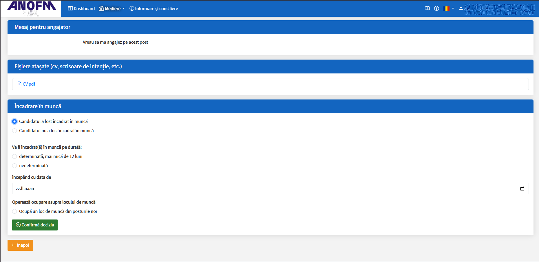 Selectați opțiunea de încadrare și completați următoarele informații:
