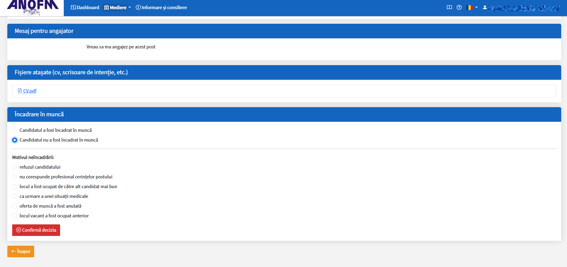 - Persoana în căutarea unui loc de muncă va primi automat o notificare prin email privind respingerea candidaturii.