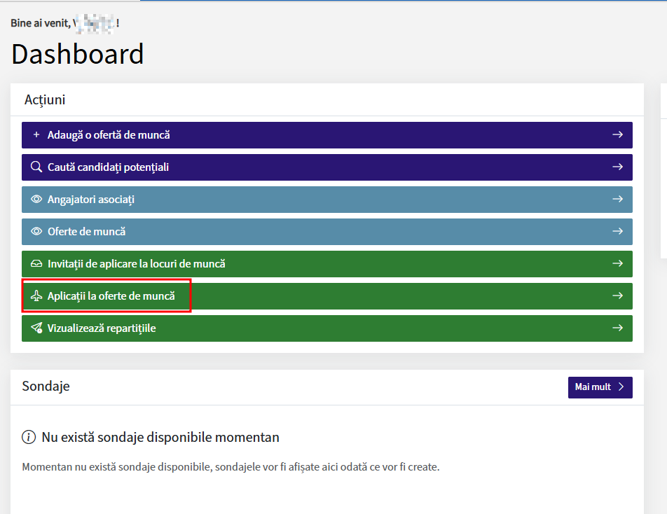 - Din pagina „Dashboard”, apăsați opțiunea „Aplicații la oferte de muncă”.