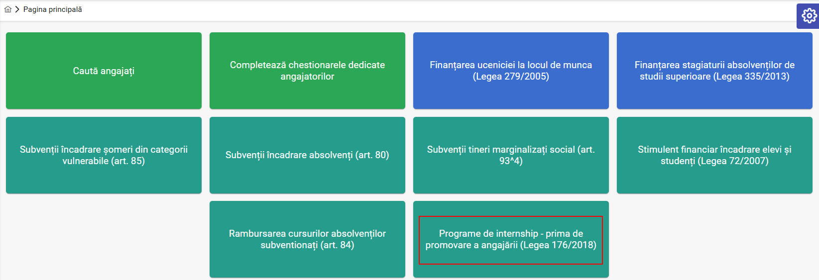 Din contul de angajator, după ce vă logați în platformă, selectați ,,Programe de internship – prima de promovare a angajării (Legea 176/2018)”.