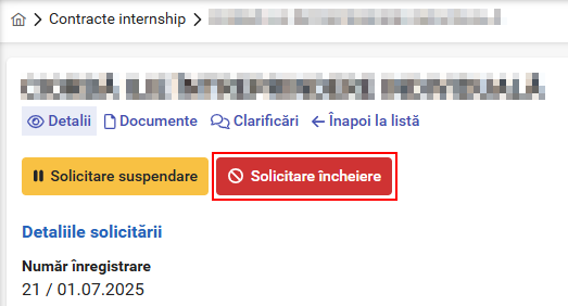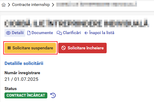 Pentru contractele de internship înregistrate pe platforma PULS cu statusul „Contract încărcat”, puteți solicita suspendarea sau încetarea (încheierea) la o altă dată decât cea care era prevăzută pentru încetarea programului de internship.