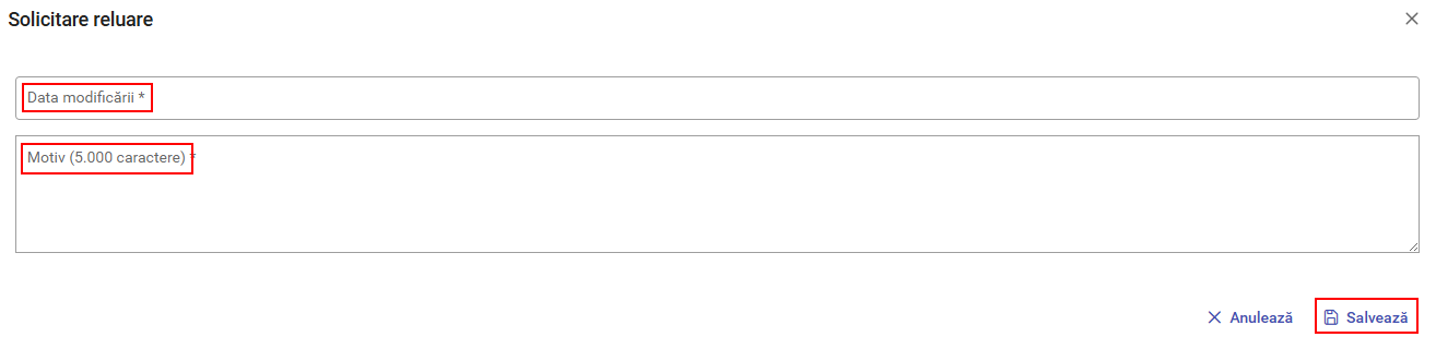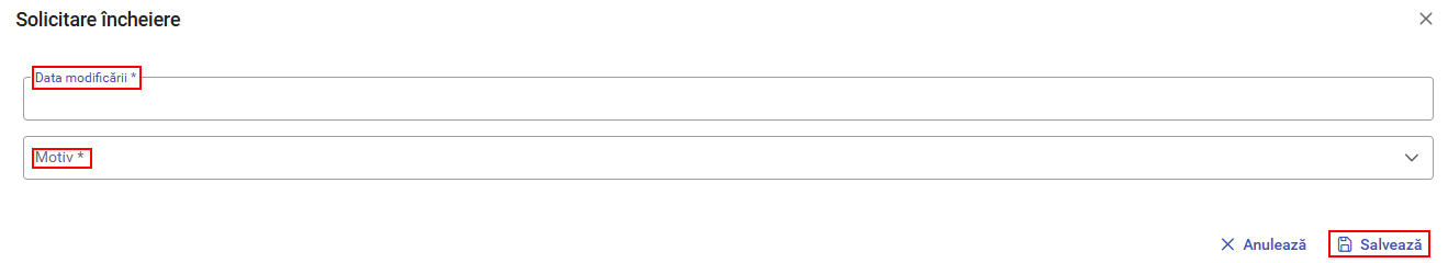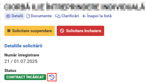 După aprobare, solicitarea primește statusul „Contract încărcat”, dacă data încheierii nu este data curentă sau „Întrerupt” dacă data încheierii este data curentă. Istoricul modificărilor este vizibil accesând butonul „Istoric solicitări de modificare”.
