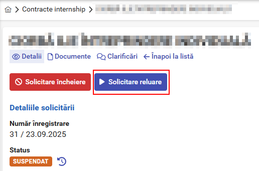 În secțiunea „Solicitări”, subsecțiunea „Listă contracte internship”, apăsați pictograma  „Vizualizează” în dreptul contractului de internship suspendat pentru care doriți să solicitați reluarea.