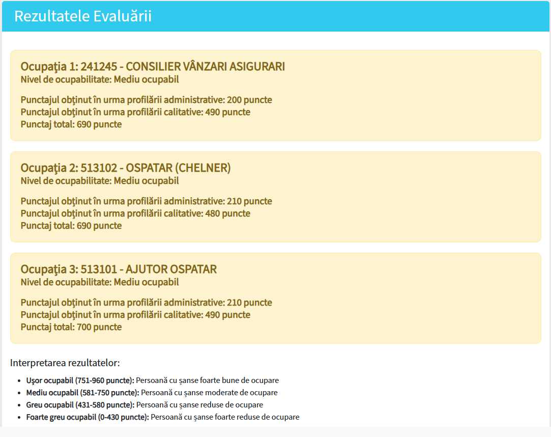 La finalul completării, aplicația calculează automat rezultatul și afișează scorul obținut în urma profilării. Acest scor reflectă nivelul dumneavoastră de ocupabilitate.