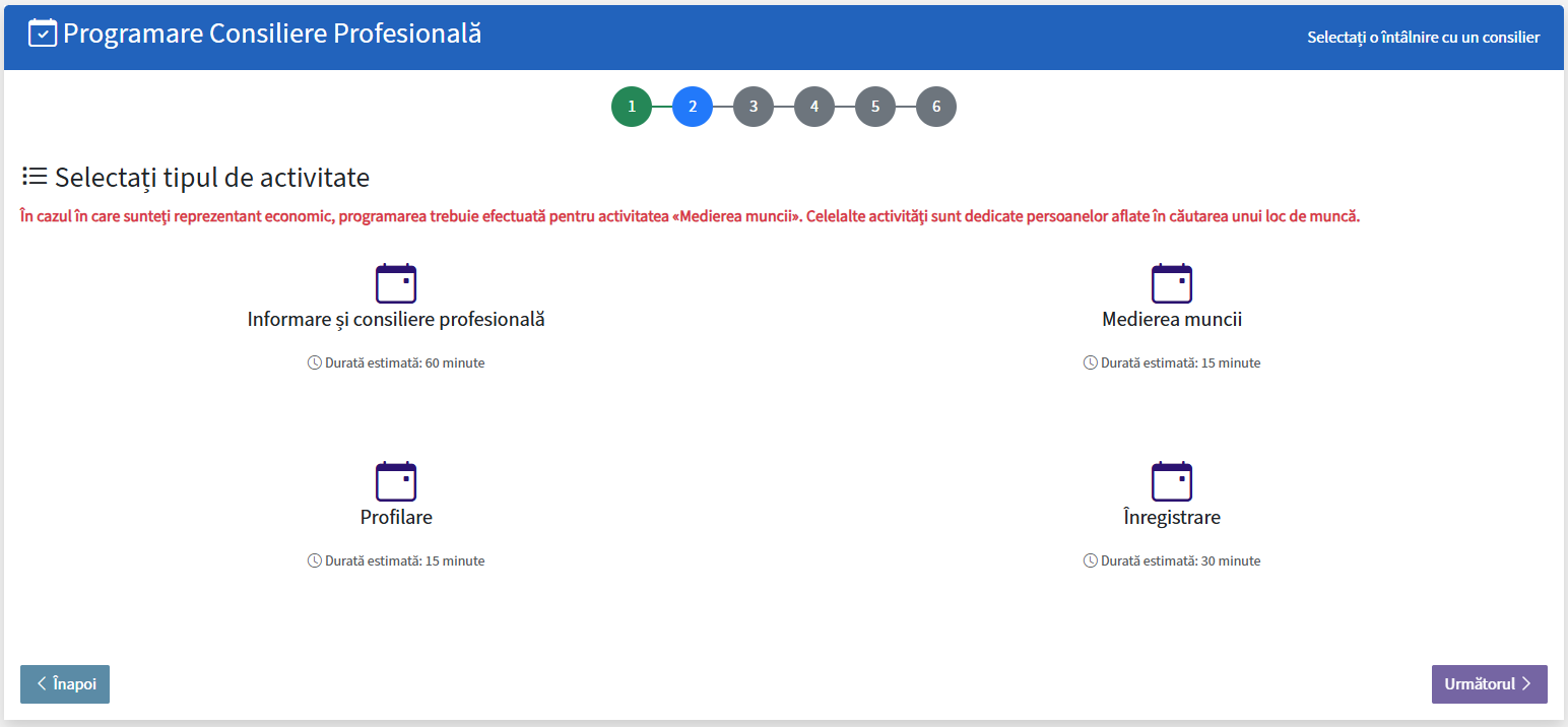 Alegeți tipul de activitate pentru care doriți să vă programați, apoi apăsați butonul „Următorul”: