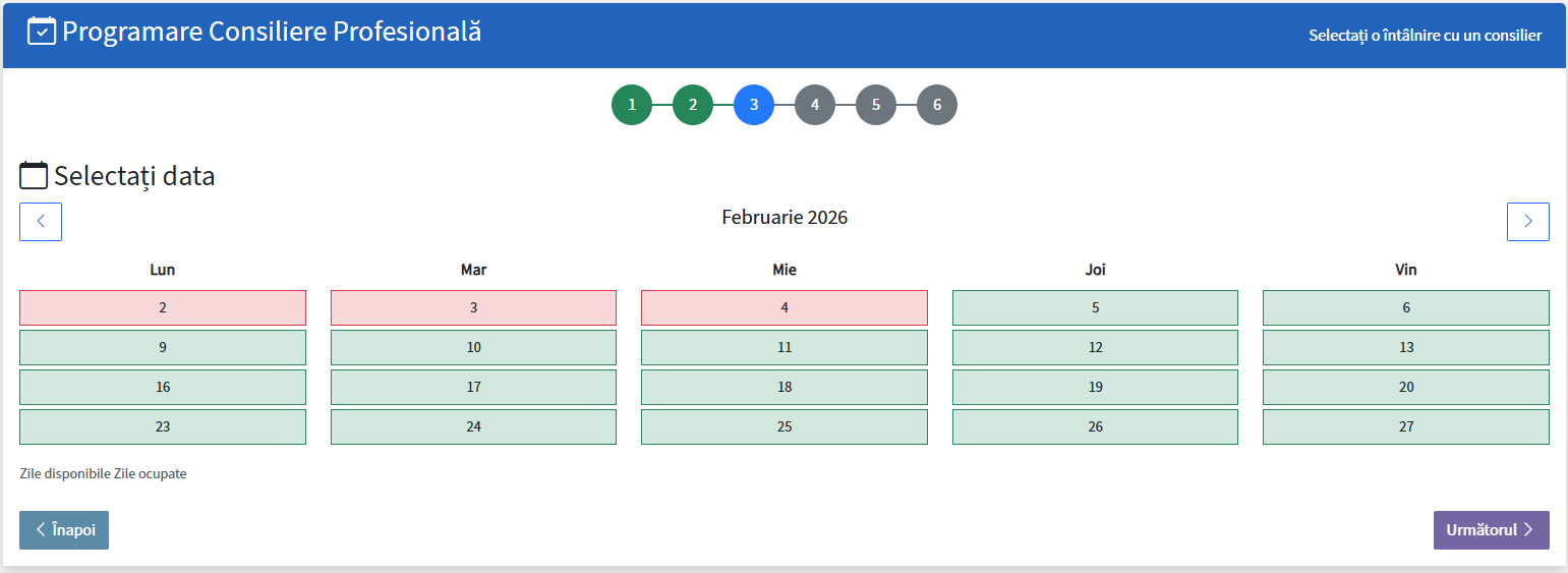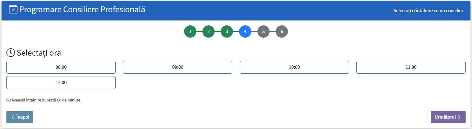 Platforma afișează intervalele orare disponibile. Optați pentru ora dorită, apoi apăsați butonul „Următorul”.