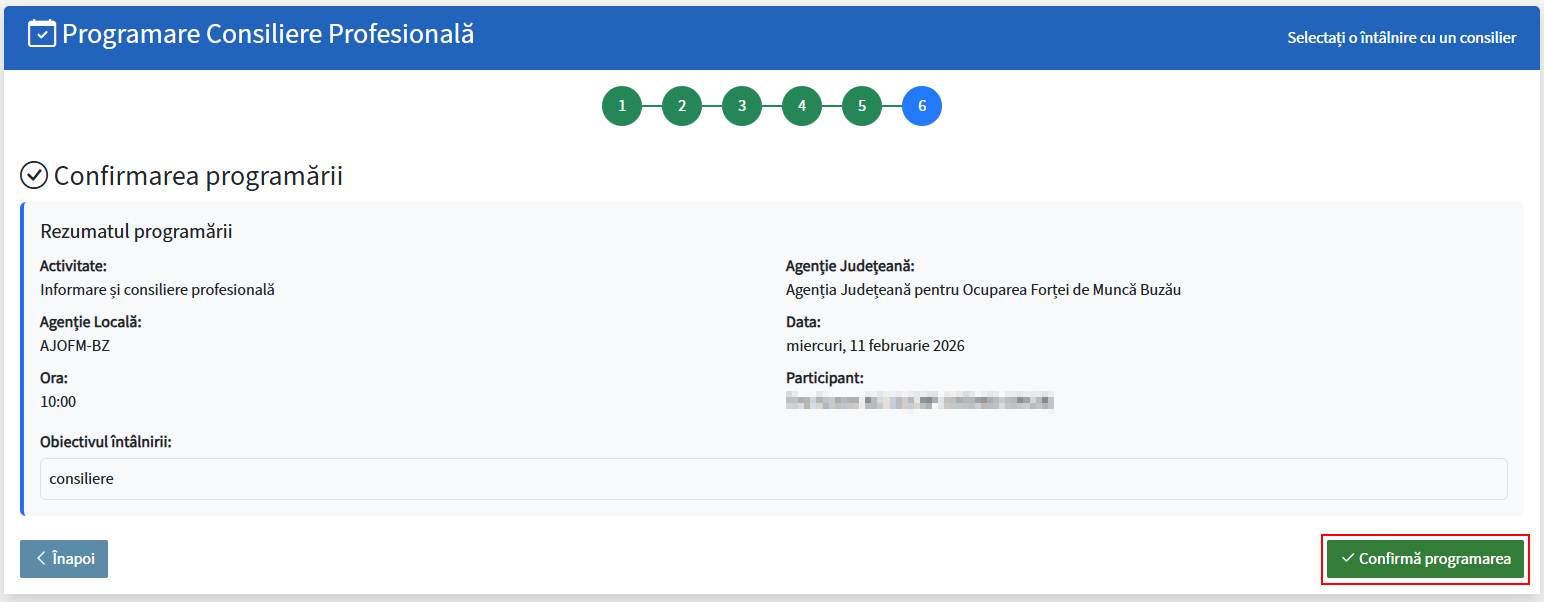 Platforma afișează informațiile înregistrate pentru programarea dvs. Dacă datele de pe ecran sunt corecte, apăsați butonul „Confirmă programarea”. Dacă doriți să reveniți asupra informațiilor introduse, apăsați butonul „Înapoi”.